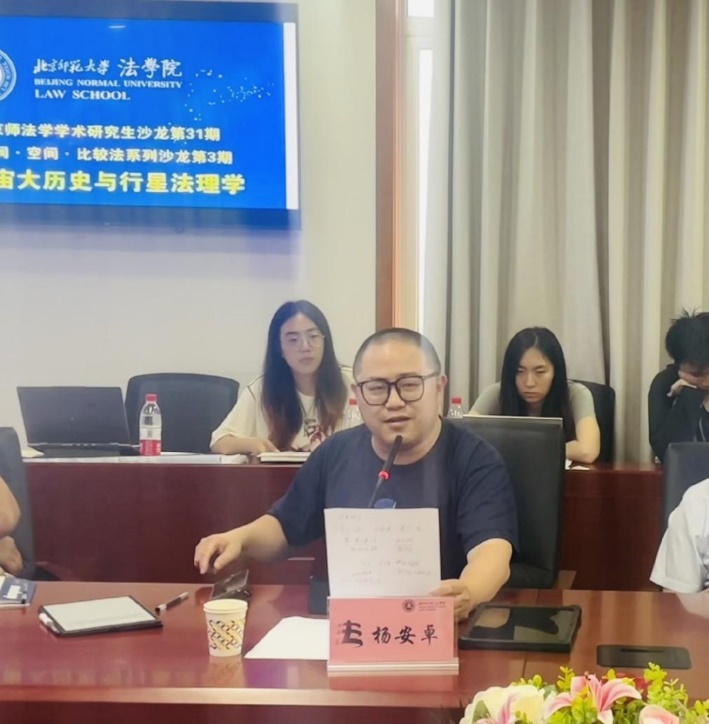 On May 18th, the 31st session of the BNU Legal Graduate Salon and the 3rd session of the Time, Space and Comparative Law Salon was successfully held in the Rear Main Building of Beijing Normal University, Haidian. The theme of this lecture was "The Big History of the Universe and Planetary Jurisprudence", and it was delivered by Associate Professor Yang Anzhuo from the Law School of Jiangxi University of Finance and Economics. Professor Ma Jianyin from the Law School of Beijing Normal University presided over the lecture, and Professor Xia Yang from the Law School of Beijing Normal University, Associate Professor Chen Yu from the Law History Research Institute of China University of Political Science and Law, Associate Professor Yu Shengfeng from the Law School/Higher Research Institute of Beihang University, and Associate Professor Shao Liuyi from the Law School of Central University for Nationalities joined the discussion.