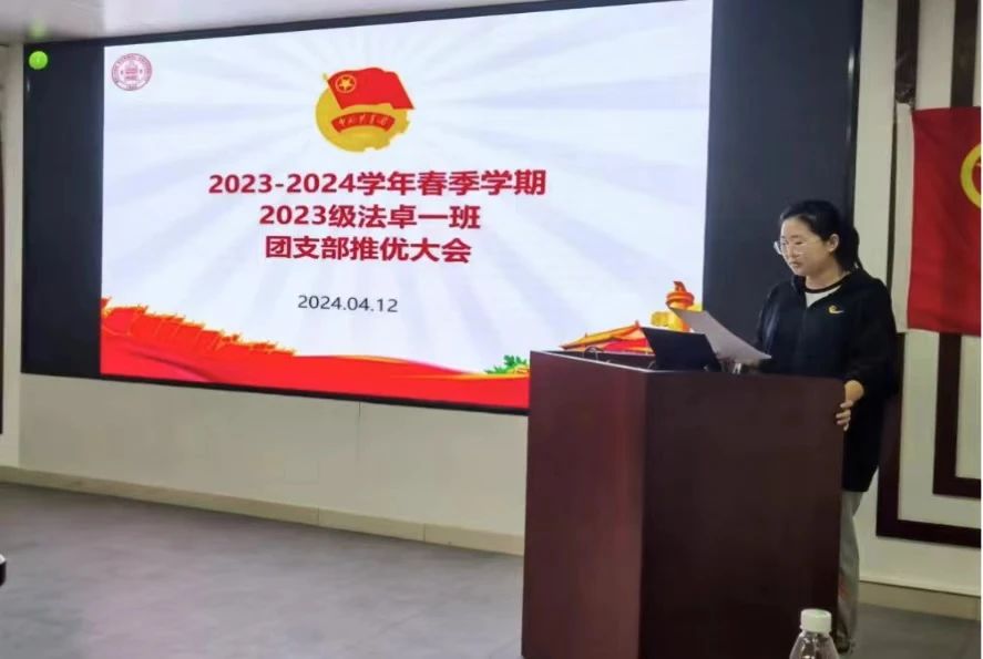 The 2023 Undergraduate Class 1 Youth League Branch Recommendation Meeting was held on time at 8:30 p.m. on April 12, 2024 in Room 1822 of the Rear Main Building. There were 52 League members who were supposed to attend the meeting, but 37 members were actually present. The meeting was chaired by the secretary of the Youth League branch Cong Muhan, and Xu Ting, secretary of the First Undergraduate Party Branch of the Law School, and Mei Xiaoyu, secretary of the Organization Department of the Youth League Committee of the Law School, were present to monitor the voting.