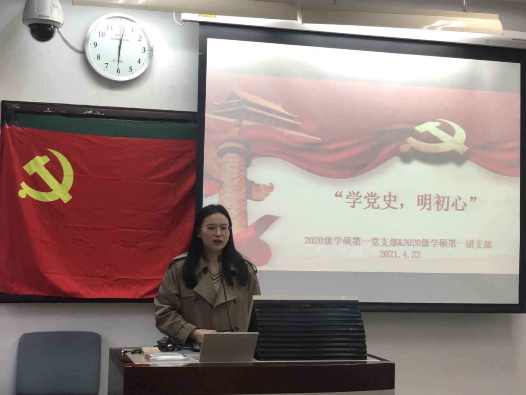 时至建党一百周年,2020学硕第一党支部为了响应习近平总书记在“党史学习教育动员大会”上的发言,锤炼党性,锻造初心,与2020学硕一班团支部于2021年4月22日合办“学党史、明初心”活动。会议由支部书记林思丽主持,特地邀请到我校历史成人视频 党史学习教育学生宣讲团成员刘宁同志开展党史讲座。本次活动共23人参加,其中正式党员应到16人,实到15人,一人因事请假。入党积极分子和班级团员参加了此次活动,活动于电子楼103开展。