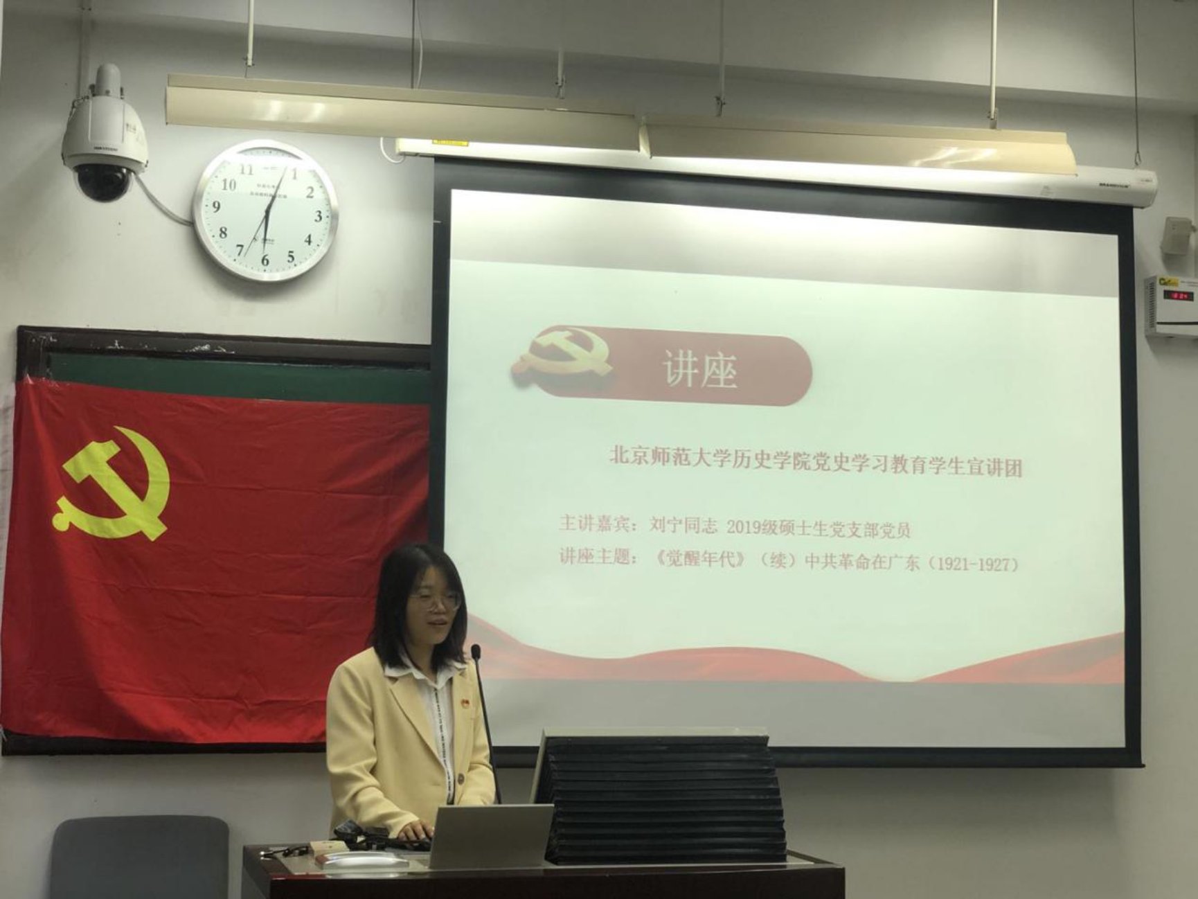 刘宁同志讲解的内容为:《觉醒年代》(续):中国共产党人的广东行(1921—1927)。其主要围绕三个章节展开,首先介绍第一章:启蒙导师下广东,铺就革命新道路。刘宁同志先从《觉醒年代》宣传片引入,介绍在思想启蒙初期,各界思想先进分子是如何在众多主义中寻找到赤色旗帜——无产阶级专政道路(马克思主义)以及马克思主义者是如何与其他主义辩论,并明确自己的纲领、路线。在第二章:热血青年聚广东,前路漫漫苦求索中,刘宁同志结合各位马克思主义先行者的活动,并结合众多历史事件将中国共产党前期活动娓娓道来,在其中展现出中国共产党各种制度的先进性,青年共产党的努力。在最后一章启航奋斗新征程,寻路不忘来时路时,刘宁同志希望我们从奋斗历程中汲取经验和教训,来面对百年未有之大变局和社会主义现代化时更有力量和智慧。