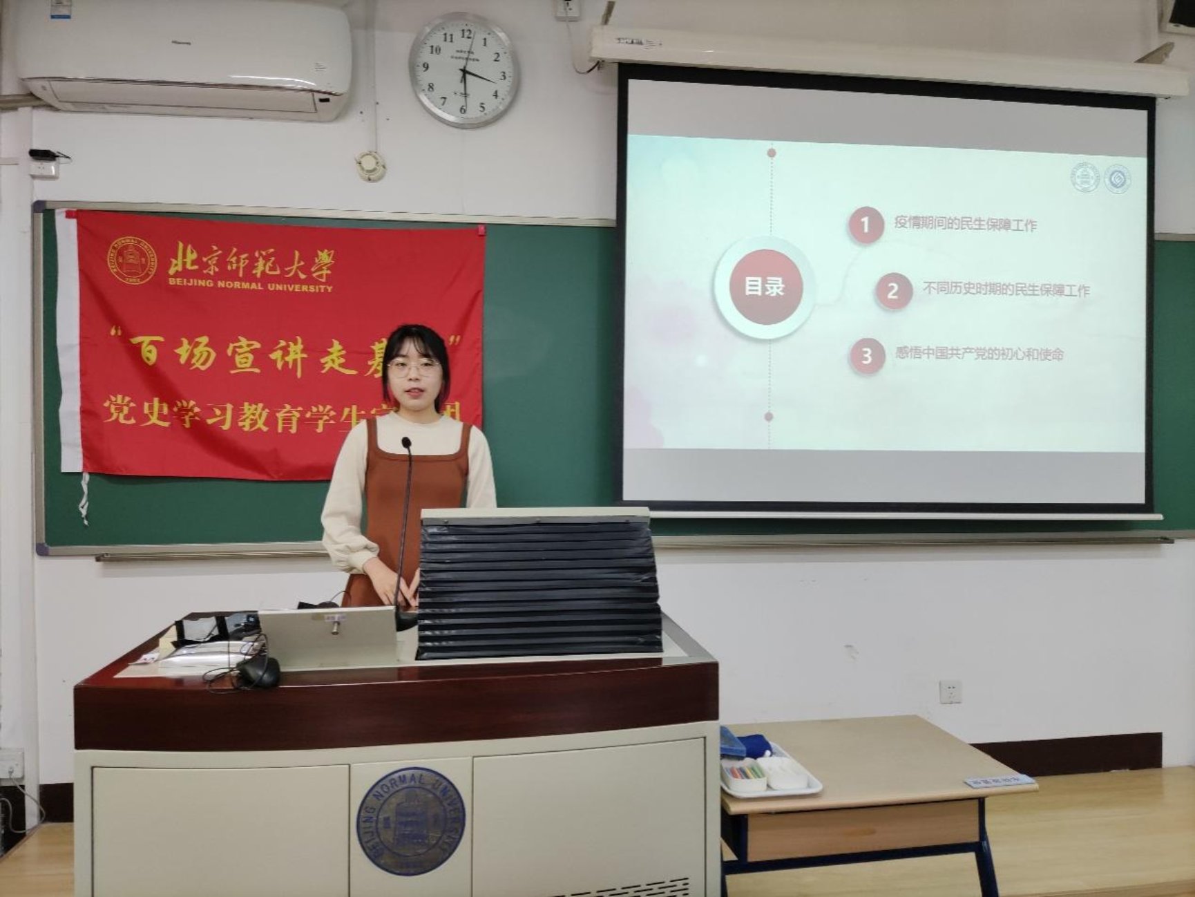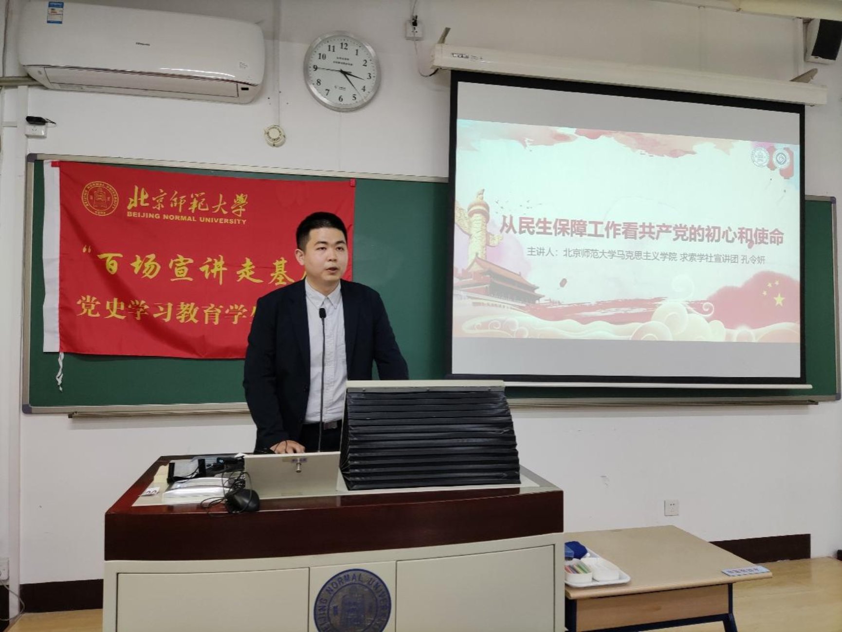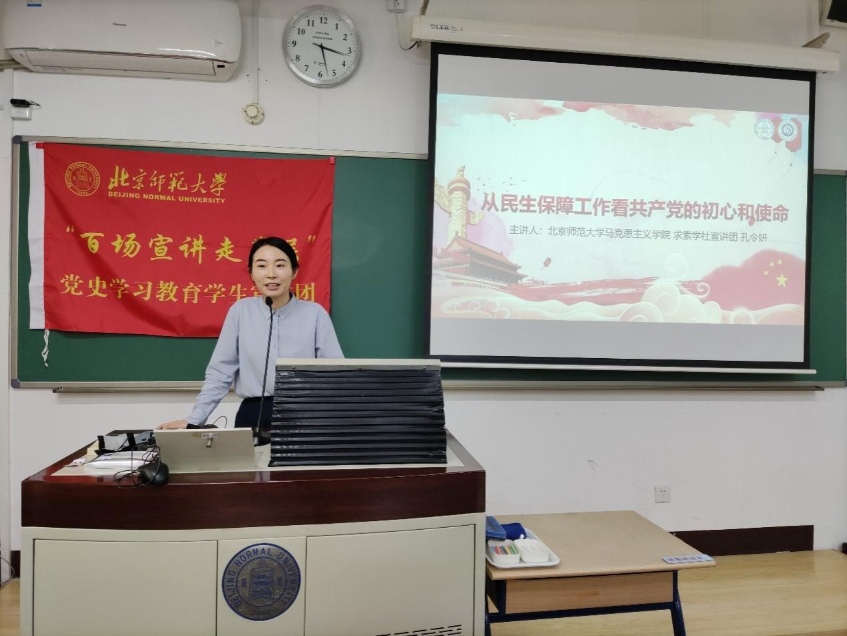 然后,来自北京师范大学马克思主义成人视频 、求索学社宣讲团的孔令妍同志进行了以《从民生保障工作看共产党的初心和使命》为题为大家进行了主题宣讲。孔同志从疫情期间的民生保障工作、不同历史时期的民生保障工作和感悟中国共产党的初心和使命三个角度完成宣讲,让在场的各位同志更深刻地认识到我们党是一以贯之坚持初心的党,党的一切工作都是从人民利益出发,从人民利益着想,我们作为青年党员要认识到自己的使命,要敢于担当,善于担当。