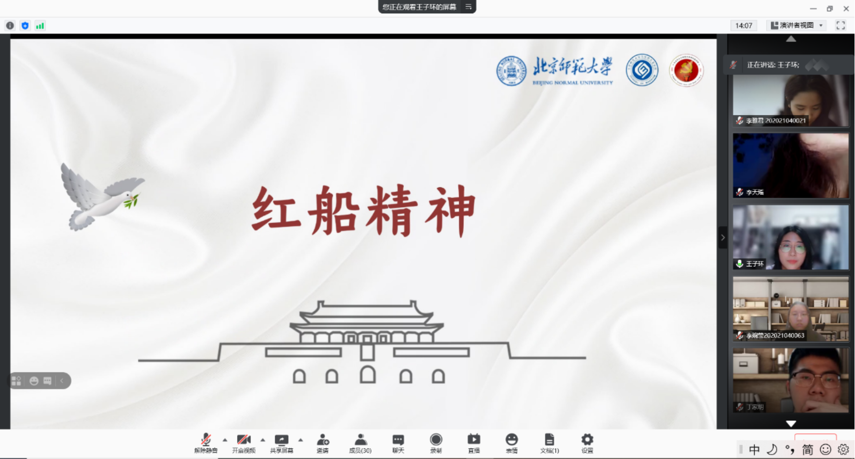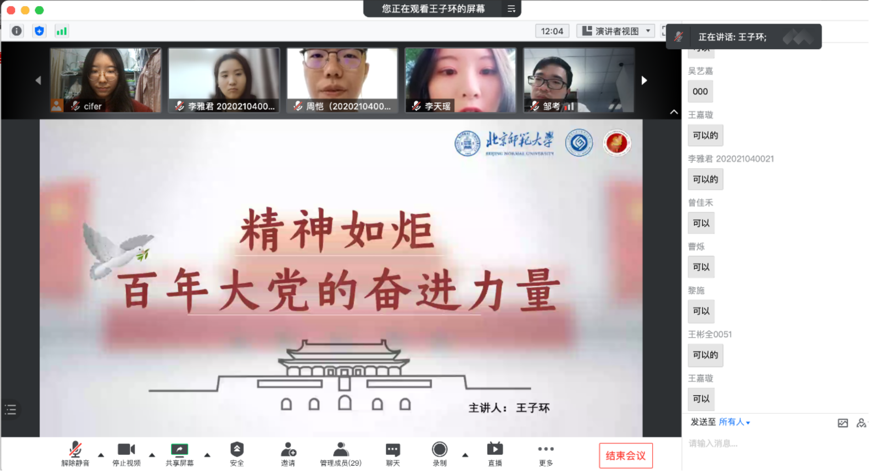 在中国共产党成立100周年之际,重温中国共产党的精神成长历程以汲取智慧和力量指导新实践,是一件具有重大意义的事情。为此,成人视频 2020级学硕第二党支部于2021年5月8日晚7时30分,邀请马克思主义成人视频 的王子环同志进行以“精神如炬,百年大党的奋进力量”的主题宣讲,开展了线上专项学习活动。此次活动由党支部书记李凌智同志进行主持,王子环同志主讲,本支部16名党员与16名入党积极分子均参与了本次活动。