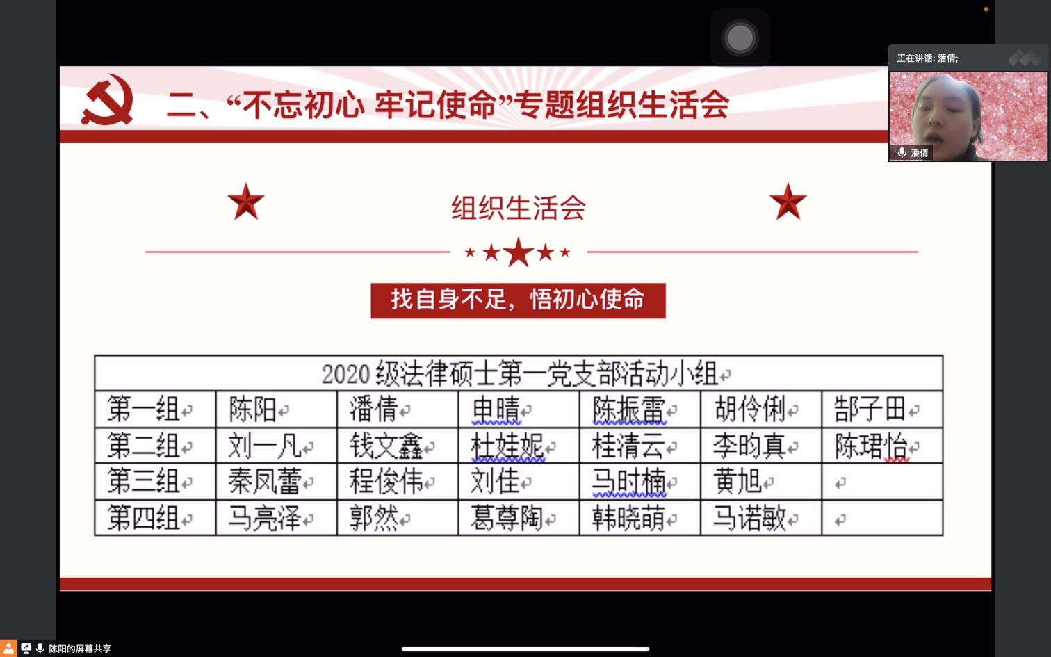 2021年3月3日,成人视频 2020级法硕第一党支部通过腾讯会议组织开展了支部全体党员大会暨“不忘初心,牢记使命”专题组织生活会,本次会议共有22名正式党员参加,会议由党支部书记陈阳主持,成人视频 党委副书记郭雅婷老师莅临本次会议。